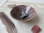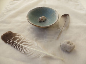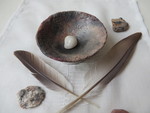 2018Reis smudge-/altaarsetje bestaande uit een keramisch schaaltje, pitfire gestookt. Inclusief: handvervaardigd (tweede hands) lederen zakje, sierkleedje, biologische witte salie, veertje, steentje, mineraal, was- of ekokaarsje en lucifers. Te gebruiken als altaar op reis en/of kleine ceremonie in de natuur. Mooi ankerpunt in een vreemde omgeving.